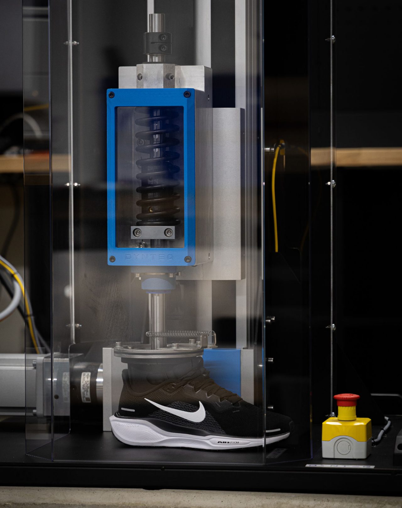 Voor de ontwikkeling van de sensor werkt WearM.AI samen met Dynteq uit Enschede, een gerenommeerde productontwikkelingspartner voor start-ups. Dynteq heeft ook een installatie ontwikkeld om de sensor en de bevestiging ervan aan de veters van een hardloopschoen te testen. De testopstelling kan daadwerkelijk stappen zetten, net als een echte hardloper. De sensor moet minimaal 100.000 stappen meegaan, ongeveer gelijk aan vijf marathons. “Met behulp van deze testopstelling kun je gericht toewerken naar een hoogwaardig eindproduct”, zegt Tijn Huttenhuis, lead engineer bij Dynteq. Tijdens de conceptfase werkte Dynteq diverse bewegingsprofielen uit, waarin de afwikkeling van de voet - van hiel naar teen - werd gesimuleerd. In overleg met WearM.AI werd bepaald welke parameters in de testopstelling moesten worden opgenomen. De belangrijkste daarvan was een versnelling van 80 m/s² (8G) bij de landing van de voet.