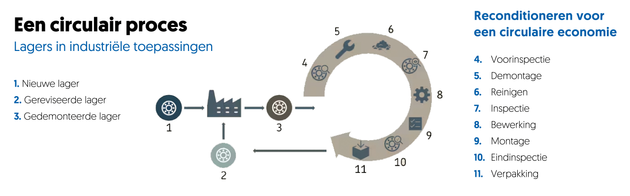 Reconditionering verlengt de levensduur van uw lagers. Het vermindert de impact op het milieu, verhoogt de betrouwbaarheid van uw installatie en verlaagt de kosten.